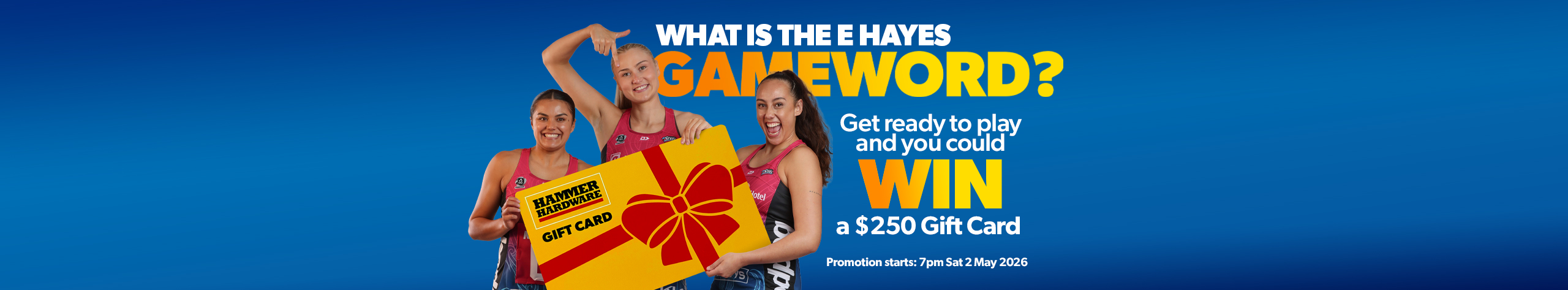 • The Gameword must be correctly identified and entered • Promotion will be open from 7pm Saturday 2 May 2026 until 5pm Friday 8th May 2026. Winner will be drawn from correct entries received and winner notified. • Entry confirms winners name and/or photo may be used by E Hayes and Southern Steel for publicity purposes. • Prize is a $250 E Hayes Gift Card, redeemable at E Hayes and Sons, Invercargill or any Hammer Hardware store nationwide. • Prize is not negotiable or transferable for cash.